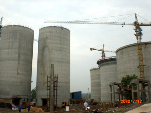 继1、3号水泥熟料库于6月4日顺利封顶之后,2号熟料库于7月8日开始滑模以来,项目部克服了连日来的高温、暴雨等恶劣气候条件的影响, 仅用7天时间便顺利完成2号熟料库滑模工作。另外两座粉煤灰库滑模工作也已顺利完成。全部5座库体的混凝土密实度、垂直度及外观都受到业主和监理的高度评价。