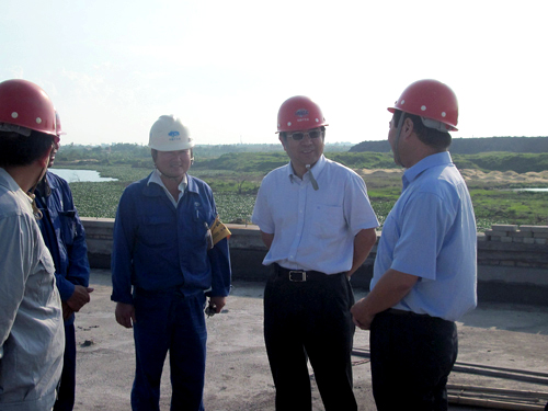在南排洪沟衔头塘提升泵站施工现场,康董事长亲切慰问了现场施工人员,并认真听取了正清经理对湛江在建项目进展情况的汇报。