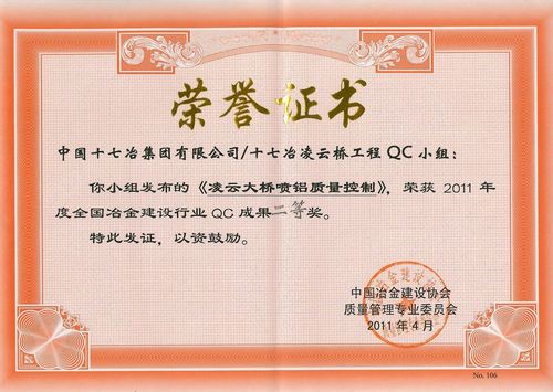 获得安徽省科学技术奖三等奖的项目成果是《黄山云谷索道建设工程》,由冶金工程技术公司研发;获得2011年度全国冶金建设行业优秀QC成果二等奖的有《凌云大桥喷铝质量控制》、《开展QC活动,控制沉井下沉偏差》、《采用公差理论控制沥青路面施工厚度》、《提高减定径机组润滑管道冲洗质量》和《提高梅钢二期公辅工程砼建(构)筑物的观感质量》等5项QC成果。