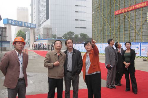秦武副市长一行在施工现场查看了金融中心已建到18层的A楼工程实体形象,认真听取了工程概况及施工进展情况。他对施工的进展、质量、安全、文明施工情况表示非常满意,并特别赞许了现场有序、整洁的施工环境,充分体现了国有企业良好作风,并勉励项目部再接再厉,安全、优质的完成工程主体结构施工。
