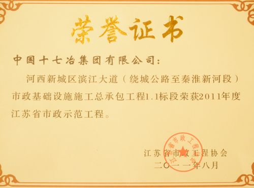 12月8日,由江苏省市政行业协会组织的江苏省市政行业发展论坛暨2011年度江苏省市政示范工程颁奖大会在苏州会议中心举行。十七冶路桥工程技术公司承建的南京滨江大道项目荣获“2011年度江苏省市政示范工程”称号。 滨江大道项目自开工以来就确立了争创江苏省优质工程的目标,始终将“效率、品质、信用使我们远行”的责任理念贯穿到优质工程创建工作中。项目部全体员工共同努力,克服了种种困难,最终圆满地完成了预期目标,为公司在南京市政工程建设市场上创造了良好的信誉。