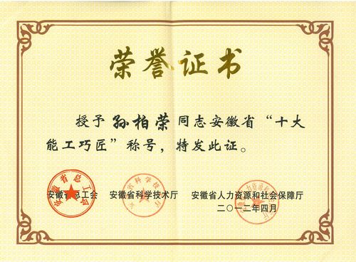 近日,从安徽省总工会、安徽省技术厅与安徽省人力资源和社会保障厅联合表彰大会上获悉,中国十七冶集团冶金工程技术公司电调处职工、马鞍山市首席技师孙柏荣荣获安徽省“十大能工巧匠”称号,并授予安徽省“五一劳动奖章”称号。