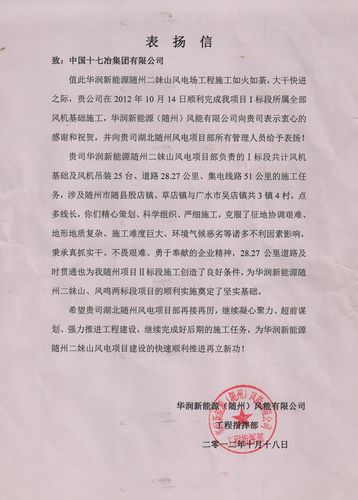 华润新能源(随州)风能有限公司表扬十七冶风力与太阳能发电工程技术公司项目部全体员工在施工中克服了点多线长、征地协调艰难、地形复杂、施工难度大等诸多不利因素,充分发扬“高效严谨、精细务实”的企业精神,科学管理,精心施工,为两个标段的顺利实施奠定坚实的基础。