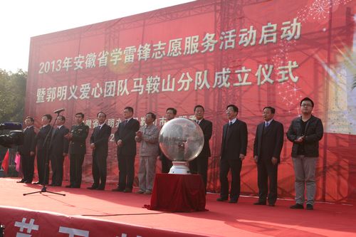 在仪式上,“当代雷锋”郭明义宣读了倡议书并向“郭明义爱心团队马鞍山分队”授旗。市委书记、市文明委主任郑为文致辞,希望广大市民以郭明义同志为榜样,积极参与到志愿服务活动中来,真正让讲文明成为一种习惯,让讲道德成为一种风尚。