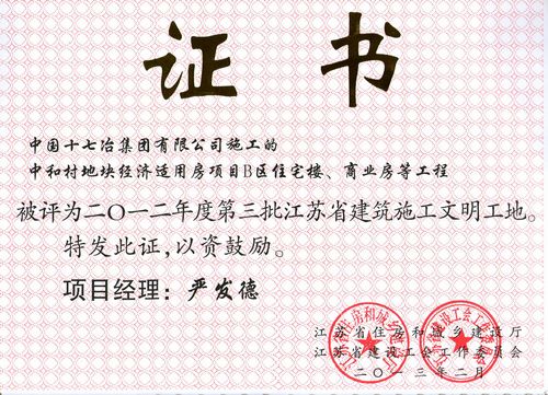 日前,由十七冶南京分公司承建的南京中和村地块经济适用房项目B区住宅楼、商业房等工程荣获2012年度第三批江苏省建筑施工文明工地称号。