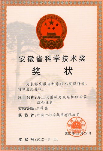 近日,从安徽省科技厅获悉,中国十七冶集团风力与太阳能发电工程技术公司的《海上大型风力发电机组安装综合技术》荣获安徽省科学技术奖三等奖。