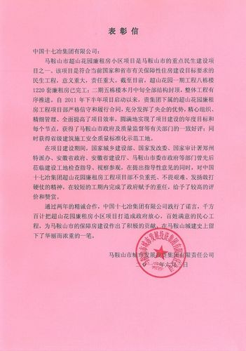 6月9日,马鞍山市城市发展投资集团有限公司专程向中国十七冶集团送来表扬信,表扬十七冶超山花园廉租房工程项目部在一期、二期廉租房工程施工中,严格信守、履行合同,不仅圆满实现了每个节点和项目建设年度目标,同时在质量上把廉租房小区项目打造成了政府放心、百姓满意的民心工程。