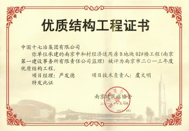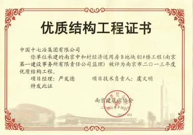 近日,由南京市建筑业协会组织的南京市“优质结构工程”评审工作圆满结束,由中国十七冶集团承建的中和村B区经济适用房01#、02#住宅楼顺利通过专家组的审查,获得了南京市2013年度“优质结构工程”奖。