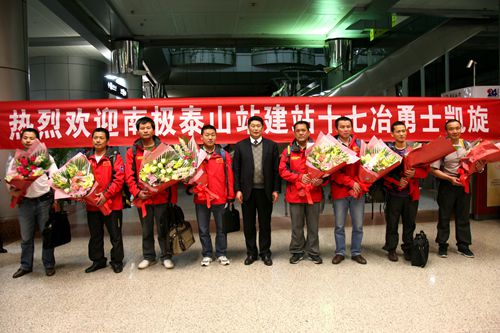 当晚23:30许,当参建员工身着统一的红色中国南极科考队队服出现在机场出口时,喻世功董事长立即迎上前去,紧紧握着领队张强的手,并送上了鲜花,随后与其他队员一一握手慰问。早就翘首以盼的家属们也都纷纷手捧鲜花上前与家人拥抱、嘘寒问暖。在简短隆重的欢迎仪式上,喻世功董事长与参建员工及家属现场合影,并表示:“衷心感谢各位参建员工的无私奉献和家属的全力支持,大家辛苦了!你们为十七冶争了光,为中冶争了光,为祖国争了光!”