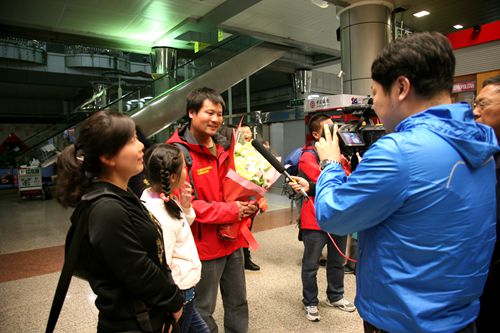 之后各位等候已久的记者们对参建队员们进行了采访。领队张强在接受采访时说:“没想到公司领导这么晚还亲自来接机,更没想到公司能够带着自己的妻儿一起来迎接,让我们非常感动,感谢公司领导的关怀!此次参与中国南极泰山站的建设,是我们终身难忘的经历,尽管我们遇到了许多难以想象的困难,但是在祖国和公司的全力支持下,我们不辱使命,顺利完成建站任务,让我们感到无比的自豪和光荣!”