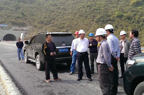 余昌文董事长先后视察了沥青路面摊铺作业面、K15+000已经摊铺完沥青下面层路段和沥青拌和站,听取了百靖高速NO.1标目前工程安全、进度、质量和施工重点难点的详细汇报。余昌文董事长对NO.1标的工程安全、质量和进度工作给予了充分的肯定,并要求百靖高速其它几个标段向NO.1标段学习,同时也希望项目部能攻坚克难,再接再厉,合理配置资源,科学组织施工,确保今年“9.28建成通车”目标的顺利实现。
