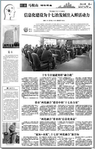 《马鞍山日报》以《信息化建设为十七冶集团可持续发展注入鲜活动力》为标题,从十年专注铺就别样“融合路”、省市“两化融合”建设中的“十七冶力量”、“两化融合”带来的“信息化效益”、“鼠标+水泥”十七冶“两化融合”新目标等方面全面报道了中国十七冶集团在实施工业化和信息化融合过程中,经历的艰难过程、近年来取得的成绩和未来的发展规划。文章图文并茂,通过大量实例介绍了十七冶在“两化融合”方面所做的工作。