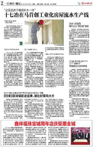 《马鞍山日报》在21日的头版上对绿色自保温组装式轻质墙板的施工工艺、特点、材料构成以及投入使用情况等进行重点报道。《皖江晚报》用了近半个版面的篇幅图文并茂地详细报道了该新型墙板优异性能、文明施工以及节能减排等方面的情况。