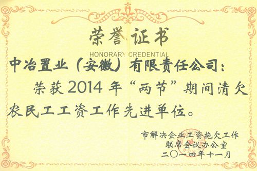 近日,中冶置业(安徽)有限责任公司获得了由马鞍山市解决企业工资拖欠工作联席会议办公室授予的2014年“两节”期间清欠农民工工资工作先进单位称号。