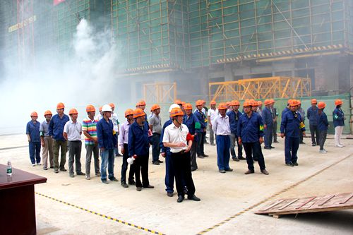 公司对此次应急救援演练事先做出了精心策划和细致安排。下午3时,总指挥、公司安监部部长做演练动员并发出演练开始指令。两名施工人员模拟报告在建施工的7#楼6层悬挑脚手架外安全防护立网起火火警,项目经理即刻启动突发事故应急处救援预案,现场迅速进入紧张而有序的应急救援氛围,抢险救援小组同时展开警戒隔离、人员疏散和干粉灭火器灭火。3时08分,现场高呼有人触电,救援人员立即以方木挑开电源线,关闭电闸,以担架转移触电人员并及时实施检查、包扎、抢救,救援车及时跟进载受伤人员到医院救治。