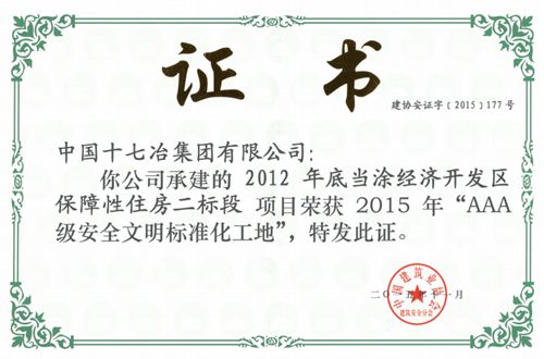 该奖项是由中国建筑协会建筑安全分会在全国范围内组织开展的大型评选活动,是国家住建部批准的安全生产最高奖项。自工程开工以来,项目部就确立了打造精品工程,争创国家AAA级安全标准化工地的目标。项目部全体人员坚持“高效严谨、精细务实”的企业作风,以全面开展安全文明生产标准化工地为核心,施工过程中严格落实各项标准规范和公司管理制度,施工全过程安全生产无事故、现场管理规范、工程质量可控、内业资料齐全,最终获得该项荣誉。