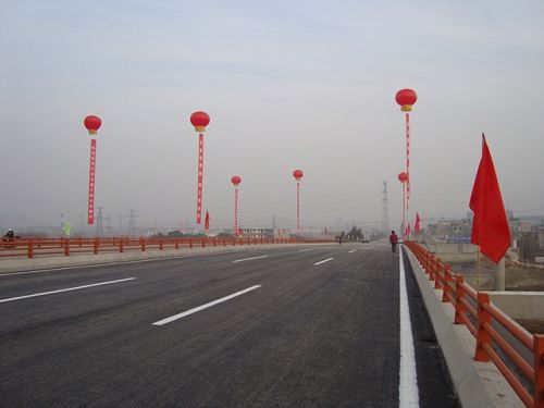 马鞍山市江东大道三期阳湖塘大桥工程,主桥分为上、下行两座独立的桥梁结构,桥梁总长198m,单幅桥宽14m。采用预应力混凝土连续现浇箱梁结构,跨径布置为24+5*30+24m,双向六车道,供机动车辆行驶。
