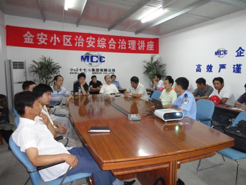 金安小区是我市重点民生工程,项目部针对夏季施工治安情况复杂、失窃案件增多、作业人员流动频繁等状况,专门邀请了昭明派出所法制宣传员为施工队伍举办了一场生动的法制综合治理讲座,讲座内容涉及建筑工地的消防、治安管理和施工工地流动人口登记造册管理等。本次讲座不仅增强了各施工队现场治安管理意识,也为提升项目治安管理提供了支持。