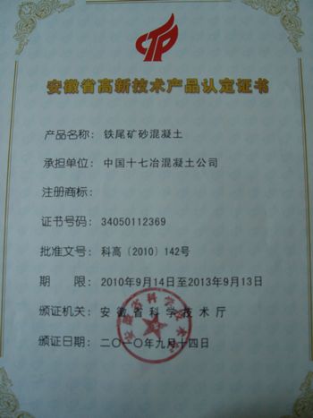 日前,物流与装备成套公司搅拌站研发的“铁尾矿砂混凝土”产品,经安徽省科学技术厅认定,批准为高新技术产品,并颁发了安徽省高新技术产品认定证书。