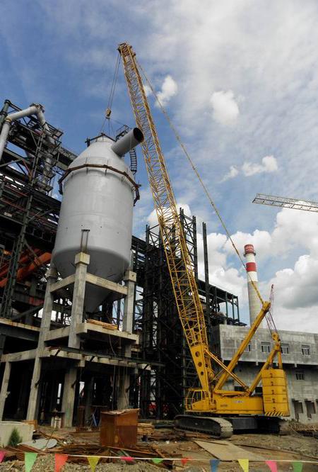 6月中旬,400吨吊车一进场,项目部就立即组织精兵强将将大吊车组装好,迅速投入到一号转运站主皮带机通廊的吊装之中,九天中连续吊装就位二号、三号、四号支架,三号、四号五号通廊。与此同时,腾出260吨吊车,顺利完成了重力除尘器的吊装。在此期间,作为高炉系统的主攻单位——机电公司机装二处,继二十六组风口大套焊接一次性通过无损检测之后,集中力量安装炉顶设备,为九十八米炉顶框架和风管的吊装做准备。机电公司管道一处主动和业主联系,对冷却壁管道实施打压检测,为筑炉工程铺平了道路;筑炉工程经过业主对捣打材料的反复检测,目前已全面展开。一号高炉系统从矿槽道铸铁机,共有电缆和导线450多公里,三个电气作业处在项目部的协调下,正有序地开展铺设工作,全力以赴为