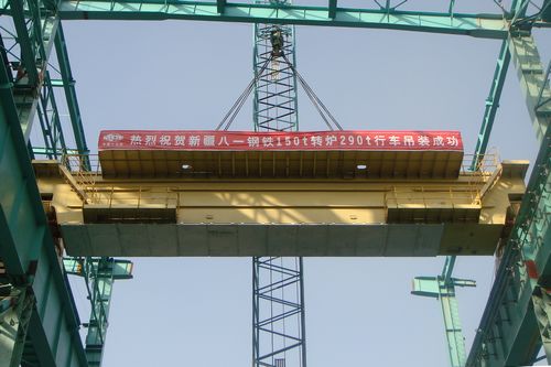 10月6日上午10时18分,由冶金工程技术公司承建的新疆八一钢铁150t转炉工程290t行车随着指挥员的哨声徐徐升起,平稳就位轨道。 该行车长21m,高3m,行车梁自重90t。项目经理部发扬“高效严谨、精细务实”的企业作风,狠抓安全措施的落实和文明施工,确保行车顺利吊装就位。290t行车吊装成功,为转炉组对拉开了序幕。