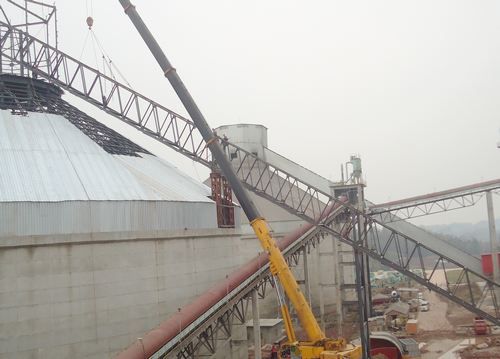 吊装前一周四川达州持续降雨,为了不影响工期,项目部在制作现场搭设临时雨篷,按期完成对斜拉链的焊接。由于一期原煤输送通廊正好穿过斜拉链下方,并且熟料库顶网架八角楼已安装,造成吊车站位困难,吊装空间狭小。项目部组织相关人员召开专题会,制定吊装专项方案,进行安全技术交底,确保吊装顺利完成。其安装质量、精度及进度均受到了业主、监理的一致好评。