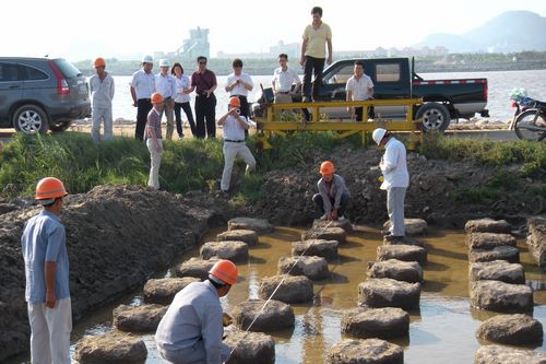 横琴新区市政基础设施BT项目堤岸工程水泥搅拌桩复合地基处理面积4.56万m2,水泥搅拌桩合计达80万延米,目前已经施工完成52万延米。珠海市建设工程质量监督站会同业主、设计、监理单位经过对水泥搅拌桩桩身强度、单桩承载力、复合承载力、桩位、桩底标高、桩径、垂直度等项目进行检测。工程质量均满足设计及规范要求,一次验收通过,受到业主、监理等各方的好评。