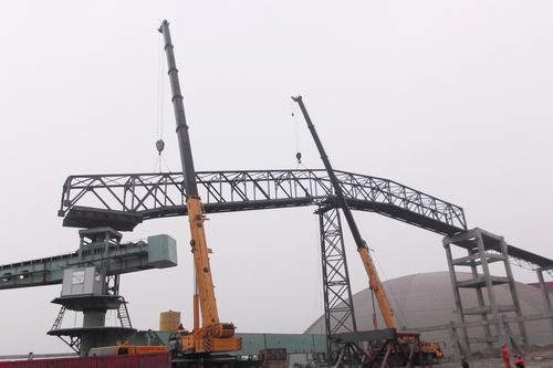 5月12日,由十七冶水泥工程技术公司承建的巢东海昌二期一线水泥熟料生产线工程原煤堆场锣锅桁架如期吊装。 原煤堆场锣锅桁架跨度为57.85m,重约60t,最大安装高度为18.8m。为缩短吊装时间、确保吊装的安全性,项目部采用分段吊装方案,充分利用现场制作的钢结构作为临时支点,采用一台130t吊车和一台70t吊车同时起吊,在临时节点上进行焊接。在吊装过程中,项目部班子成员现场全程跟踪指挥,仅用了4个小时便完成了吊装,为设备安装创造了条件。