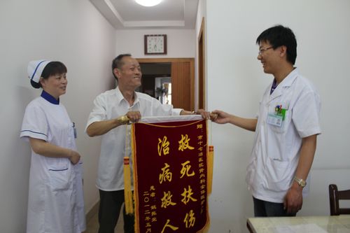郭成金老人为了感激肾内科的医护人员,连续两次要请肾内科的医护人员吃饭,都被大家婉言谢绝了。老人不知如何表示感激,就专门制作了一面“救死扶伤,治病救人”的锦旗,送到医院,以表他的感激之情。