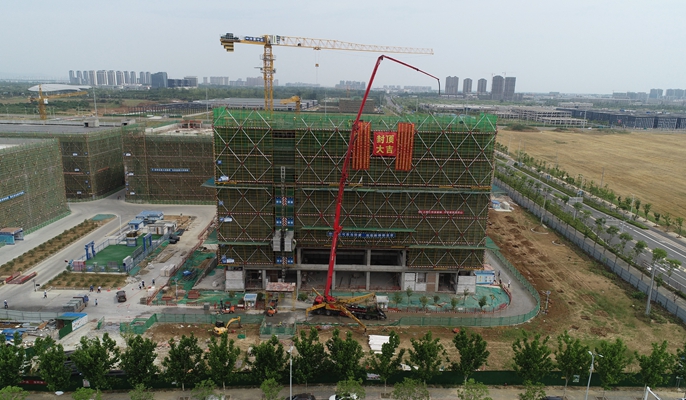 滁州南谯区省际毗邻新型功能区启动区工程包括定制化厂房工程、拓展区路网工程和启动区路网工程等。其中定制化厂房工程位于文华路与永兴路交叉口西北侧,规划用地面积约100.06亩,总建筑面积约11万平方米,主要建设综合楼、生产厂房、综合动力车间、门卫、室外景观绿化、室外管线等工程;拓展区路网工程和启动区路网工程包含新建道路9条,中小桥1座,道路总长约8703米,主要建设路基、路面、给排水、路灯、路牌、绿化、交通安全等工程。此次封顶的综合楼总建筑面积16841.06平方米,地下一层,地上八层,建筑结构为框架结构。