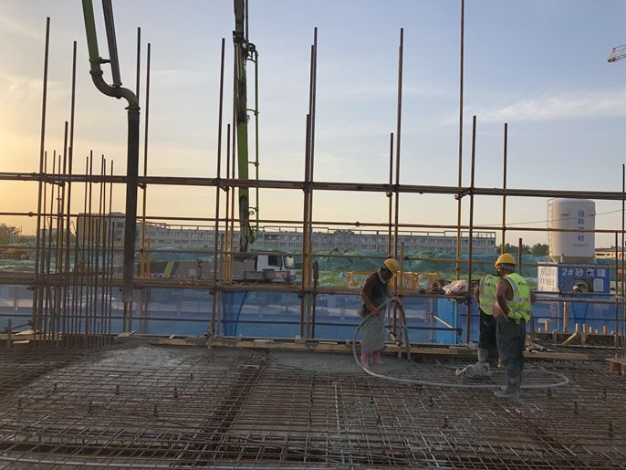 响水县人民医院新院区、妇幼保健院项目是响水县公共卫生领域十三个重点项目之一,规划总建筑面积约28.28万平方米。本次顶板浇筑区域板厚最大为350毫米,浇筑量为1400立方米,分三种标号浇筑。为保证顶板的多种标号混凝土的顺利、正确浇筑,项目部制定了详细的混凝土浇筑专项施工方案,并对施工班组进行详细交底,组织施工人员进行倒班工作模式,同时做好质量控制和安全施工等方面的专项措施,为实现病房楼关键施工节点提供了保障。
