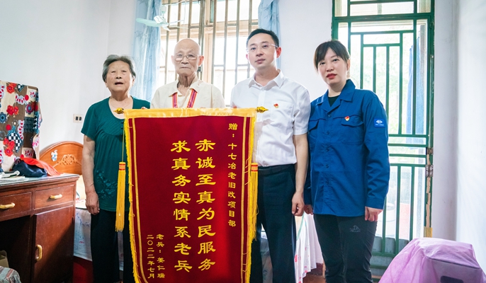 7月29日下午,分公司副经理易宁和雨田社区党委书记来到马鞍山市雨山区老旧小区整治工程项目现场,开展“共叙军旅情、喜迎二十大”建军节慰问退役军人活动。大家为参加革命战争的退伍军人姜仁瑞、贺布荣送上米、油、牛奶等慰问品,并致以节日问候和祝福。姜仁瑞老人参加过淮海战役、京沪杭战斗及抗美援朝战役等众多赫赫有名的战役,贺布荣老人参加过渡江战役、淮海战役,为解放新中国和祖国建设作出了巨大贡献。大家对老人们保家卫国的奉献精神致以崇高的敬意,并详细询问了老人们的身体状况和家庭情况,项目部负责人还为退伍老兵家人详细介绍了小区整治改造的情况。老人们表示,现在老小区进行改造修缮,他们都很高兴,很感激项目部的工作人员们一直惦记着老兵,并为项目部送上“赤诚至真为民服务、求真务实情系老兵”的锦旗。