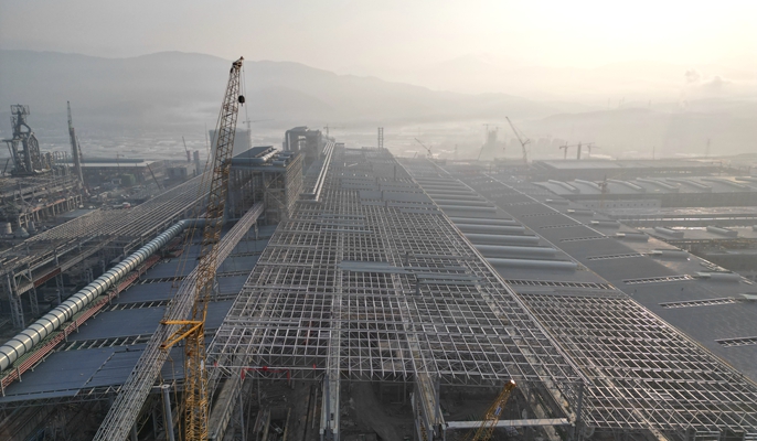 玉昆钢铁产能置换升级改造炼钢炼铁工程位于云南省玉溪市峨山大化产业园内,此次升级改造项目共分为两个系统,即炼钢系统与炼铁系统。炼钢系统施工主要内容包括新建炼钢连铸主厂房(15-31线)、3#/5#转炉及其配套辅助设施、地下水管廊、1#SVC室、2#主控楼等。此次封顶的炼钢连铸主厂房由加料跨、转炉跨、精炼跨、钢水接受跨、浇铸跨、切割跨、出坯跨等组成,钢结构总量约24380吨。自主厂房钢结构施工以来,为确保工程节点,项目团队齐心协力,科学组织,精心施工,因地适宜制定吊装方案,确保了本次封顶节点顺利完成。项目部将继续发扬“一天也不耽误,一天也不懈怠”的企业精神,践行“24小时工作法”,贯彻落实“项目管理提升年”和“安全生产提升年”活动要求,加强现场安全、质量管理,确保工程进度,充分展现“炼钢精炼国家队”的雄厚实力,高效推进项目建设。