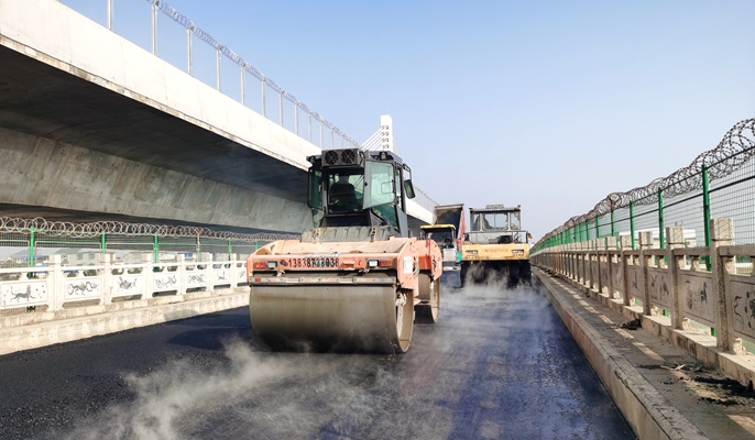 姚站岗北跨渠公路桥,位于项目新建姚站岗南水北调特大桥东侧,在特大桥建成通车后承担地面辅道跨越干渠的功能,该桥全长127米,桥面沥青面层宽9米,设计厚度4厘米,沥青摊铺采用一台摊铺机半幅摊铺,一台双钢轮压路机和一台胶轮压路机组合碾压。为确保摊铺过程安全合规,项目部超前谋划、精心组织,在施工现场摆放齐全的安全标识,并安排安全管理人员进行交通导行,保障施工安全;严格控制沥青混合料的拌合、运输、摊铺、碾压、检测等各个环节,保证沥青摊铺质量。