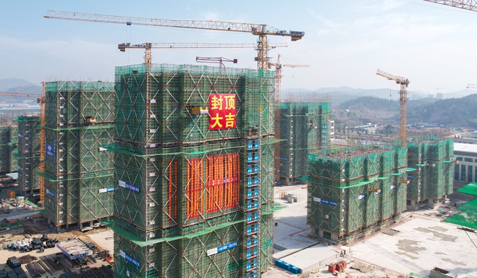 本项目位于安徽省马鞍山市花山区软件路与毓秀路交叉口东南角,总用地面积为54993.69平方米,总建筑面积为151560.9平方米,建设内容包含14栋18层高层住宅、1栋开闭所、地下车库及物业、养老等配套用房,是马鞍山市一项重要民生工程、海绵型小区工程。此次封顶的9#楼总建筑面积8205.61平方米,总层高18层,地下两层,总高度52.4米,采用剪力墙结构。项目建成后,将进一步提升马鞍山东部城区人口入住率。