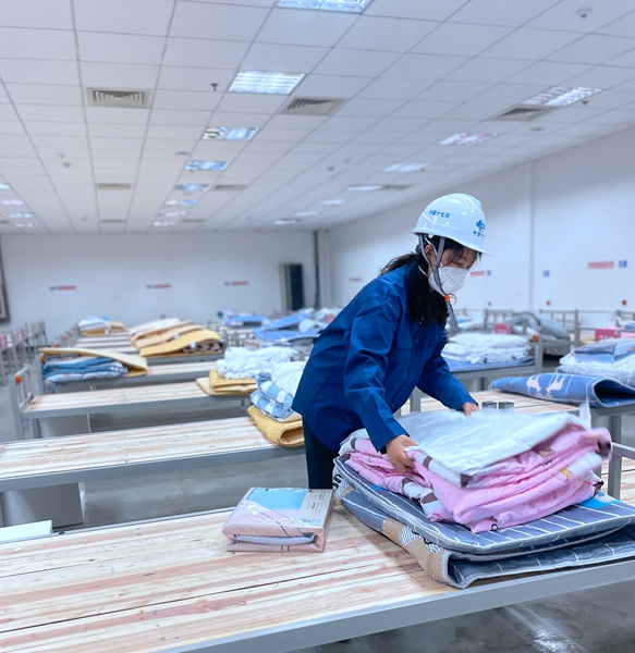 唐志华是城建分公司一名20余年党龄的老党员,也是此次城建分公司出征的唯一一名女同志。4月13日上午,在接到援建上海临港方舱医院的紧急通知后,她第一时间便报名了。“女儿,我也到上海了,十七冶在援建上海方舱医院,我主动报名来了。”4月15日下午2点,刚刚进入施工现场,唐志华便给在上海工作且也在抗疫一线奋战的女儿发去了一条消息。因为和女儿在同一个城市,不同的战线,完成着共同的使命,让唐志华干劲十足。”能够同女儿以不同的身份,共同参与到上海抗疫中来,十分有意义,作为母亲,我不能落后。”负责城建分公司施工队伍后勤保障工作的唐志华到达上海嘉定后,立即投入到工作中,安排员工食宿,为工人铺设床铺。16日晚,她将赶往临港方舱医院项目现场,为现场数百名工人做好后勤保障。