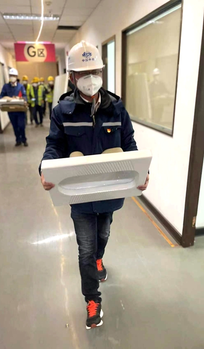 水电工程师鲁民在搬运马桶