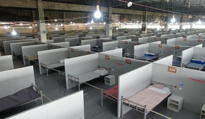 15日,完成全部440台风扇的安装,约1200组床位电路铺设,20组临时厕所组装,完成500米进场隔离通道的安装。