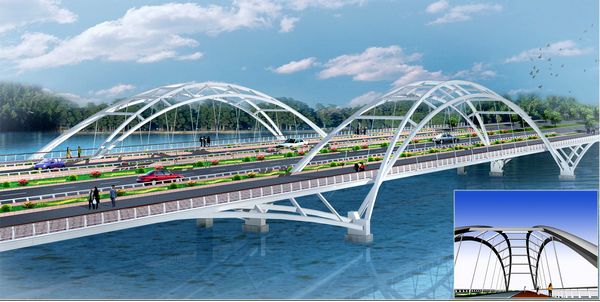十七冶承建的马鞍山江东大道三期阳湖塘大桥工程位于佳山乡以南,梅山北侧,拟建于规划中的梅山公园--阳湖塘水域。大桥全长198,总宽度61.3。采用月牙型钢拱桥+连续箱梁结构,全桥分为相对独立的四座桥。其中中桥、边桥各为两座。中桥采用预应力混凝土连续现浇箱梁结构,跨径布置为24+5*30+24m,双向六车道,供机动车辆行驶。边桥采用月牙型钢拱桥,跨径布置为24+30+90+30+24m,最大跨径为90m,造型轻盈美观,供行人和非机动车使用。该工程荣获2012年度安徽省省优“黄山杯”。